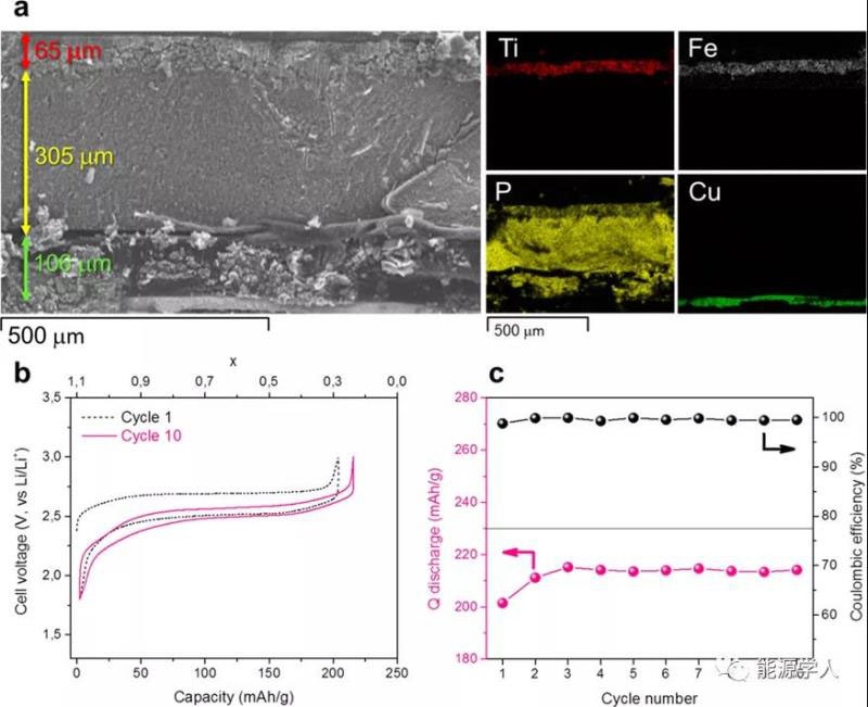 圖4LTFS + β-Li3PS4 (70-30 wt %) |β-Li3PS4 | Li 電池。(a)電池截面的SEM圖片和EDX元素分布;(b)恒流充放電曲線;(c)放電容量和庫倫效率。