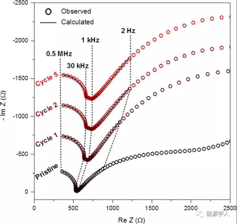 但是,計算出的固態(tài)電解質(zhì)電阻為529 Ω,循環(huán)后增加到640-670Ω,這暗示性能的下降可能與循環(huán)過程中InLi負極的體積變化(53%)有關(guān)。