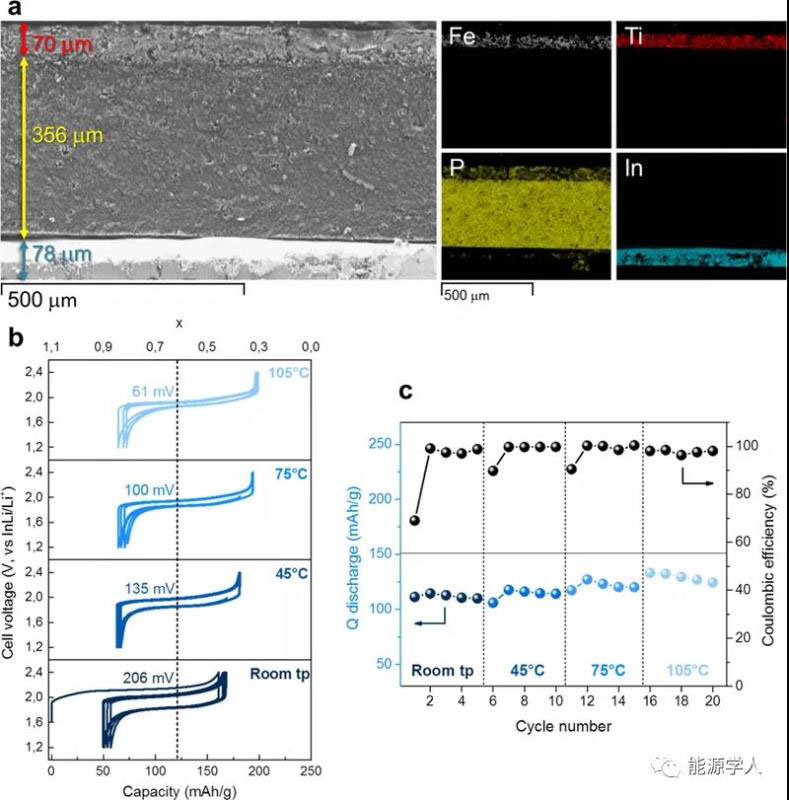 圖2 LTFS + β-Li3PS4(70-30 wt %)|β-Li3PS4|InLi電池。(a)電池截面的SEM圖片和EDX元素分布;(b)恒流充放電曲線;(c)不同溫度下的放電容量和庫倫效率。