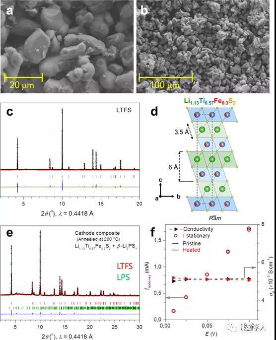 圖1(a,b)Li1.13Ti0.57Fe0.3S2(LTFS)的掃面電鏡圖片;(c)LTFS的SXRD圖和Rietveld精修;(d)LTFS的晶體結(jié)構(gòu);(e)LTFS/β-Li3PS4(70?30 wt %)復(fù)合物在200度加熱5天后的SXRD圖和Rietveld精修;(f)LTFS/β-Li3PS4 (70?30 wt %)的穩(wěn)態(tài)電流和dc電導(dǎo)率。