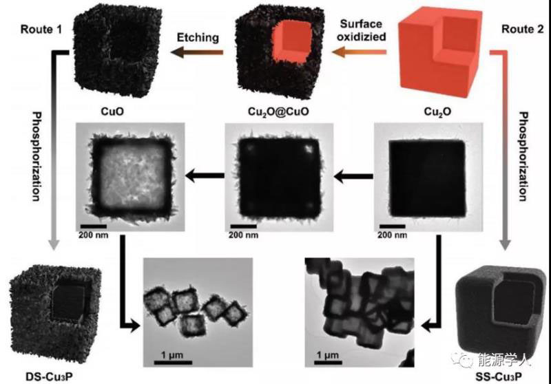 在本文中,臥龍崗大學(xué)侴術(shù)雷教授聯(lián)合澳大利亞同步加速器中心首席科學(xué)家 Qinfen Gu研究員、溫州醫(yī)科大學(xué)劉勇教授等課題組根據(jù)銅前驅(qū)體的不同形貌,通過磷酸化反應(yīng)合成出一系列磷化銅材料,其中雙殼磷化銅空心納米立方(DS‐Cu3P)在≈0.2 V (放電)和≈0.9 V (充電)電位處具有可逆的氧化還原反應(yīng),在50 mA·g?1電流密度下可提供325 mAh·g?1的高容量。通過同步輻射粉末X射線衍射(PXRD)可證實材料中的可逆相變,通過對循環(huán)伏安曲線和電化學(xué)阻抗譜的分析,作者發(fā)現(xiàn)贗電容貢獻(xiàn)和穩(wěn)定的固態(tài)電解質(zhì)界面膜使電池具有優(yōu)異的倍率性能和循環(huán)壽命。此外,作者還合成了較厚的單殼層Cu3P空心納米立方(SS‐Cu3P)和塊狀Cu3P (B‐Cu3P)作為對照。研究表明,較厚的殼層和塊狀結(jié)構(gòu)會阻礙Na+離子和電子的遷移,導(dǎo)致緩慢的反應(yīng)動力學(xué)。