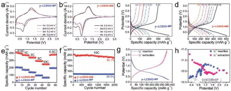 在本文中,復(fù)旦大學(xué)車仁超教授聯(lián)合青島大學(xué)林春富教授等課題組通過一種Cr3+–Si4+共摻雜Li3VO4(LVO)的策略,成功設(shè)計出一種具有穩(wěn)定、高能、快充、安全的新型負(fù)極材料γ相 Li3.08Cr0.02Si0.09V0.9O4(γ‐LCSVO)用于鋰離子電池。具有自由3d電子的Cr3+加入能夠有效地提高電子電導(dǎo)率和倍率性能,因此作者制備出兩種不同形貌的γ-LCSVO材料。通過靜電紡絲策略和固相反應(yīng)法可分別制備出γ-LCSVO納米線(γ‐LCSVO‐NW)和γ-LCSVO微米級顆粒(γ‐LCSVO‐MP),兩種材料均具有優(yōu)異的綜合電化學(xué)性能,可滿足高性能LIBs的關(guān)鍵要求。利用原位X射線衍射(XRD)、原位透射電子顯微鏡(TEM)、幾何相分析(GPA)、密度泛函理論(DFT)計算和球差校正掃描電子顯微鏡(STEM),作者對γ-LCSVO的Li+存儲機理進(jìn)行了深入研究。結(jié)果表明,Li+依次插入γ-LCSVO的4c(1)和8d位點,但其最大體積變化和平均應(yīng)變分別僅為0.18%和0.07%。因此,γ-LCSVO具有典型的“零應(yīng)變”特性,并具有杰出的循環(huán)穩(wěn)定性,在10C下進(jìn)行2000次循環(huán)后,γ-LCSVO-NW和γ-LCSVO-MP的容量保持率分別為90.1%和95.5%。