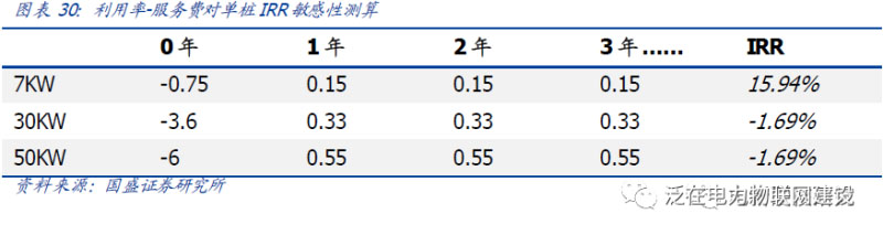 若以充電服務(wù)費(fèi):0.5元/度;充電樁利用率:7%;充電費(fèi)分成:服務(wù)費(fèi)的10%作為基礎(chǔ)假設(shè),7.5kw慢充/30kw快充/50kw快充IRR分別為16%/-2%/-2%