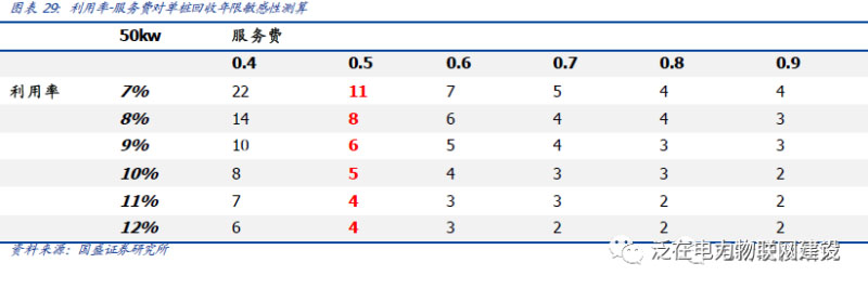 若保持0.5元服務(wù)費(fèi)不變,當(dāng)充電樁利用率從7%提升至12%時(shí),單樁投資回收年限會(huì)從11年縮短至4年,明顯小于設(shè)備可使用的年份上限。