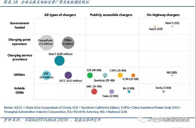電力公司以公共服務(wù)為主,建設(shè)規(guī)劃中規(guī)中矩,各國(guó)電力公司如Enel(意大利國(guó)家電力公司)、EDF(法國(guó)電力集團(tuán))、SCE(南加州愛迪生電力公司)、Iberdrola(西班牙電力公司)、SGCC(中國(guó)國(guó)網(wǎng))、SCPG(中國(guó)南網(wǎng))、NG(英國(guó)國(guó)家電網(wǎng))等均參與充電網(wǎng)運(yùn)營(yíng)布局。