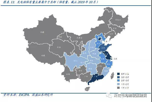 廣東、江蘇、北京、上海四省市截止2019年10月保有量均在5萬(wàn)個(gè)以上,從總量上占比均在10%以上。前五大省市充電樁保有量占比55.3%,前十五省市保有量占比88.4%。
