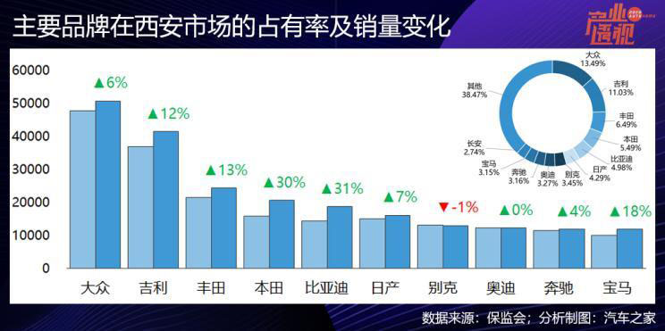 西安去年的新車銷量達(dá)37.7萬輛,微增0.03%。西安是吉利汽車最大的單一區(qū)域市場,在西安的市場占有率高達(dá)11%,僅次于大眾,高于日系品牌,且去年實(shí)現(xiàn)了12%的大幅增長,前十大銷量品牌中,去年在西安市場唯一折戟的是別克,其中昂科威和威朗的銷量下滑,但英朗和君威的銷量都增長了30%以上,別克GL8的銷量也保持穩(wěn)定。