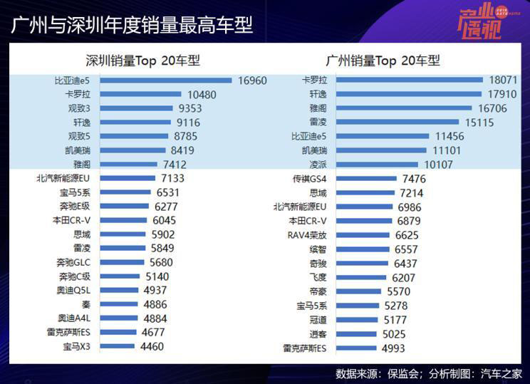 兩地?zé)徜N車型方面,比亞迪e5作為出租車在深圳銷量第一,觀致的兩款車型進(jìn)入到深圳銷量前五名。豐田卡羅拉和日產(chǎn)軒逸在廣州和深圳都是私家車熱選車型,在銷量排行榜上都很靠前。深圳市場豪華品牌車的整體銷量比廣州高,比如,寶馬2款、奔馳3款、奧迪2款進(jìn)入深圳的熱銷車型Top 20榜單,而在廣州只有寶馬5系一款車進(jìn)榜,且銷量沒有深圳多。另外,雷克薩斯ES都進(jìn)入了兩地的熱銷車型榜,2019年,雷克薩斯銷量最高的城市就在廣州,第二大市場是上海,深圳是第三大區(qū)域市場,這三個(gè)城市的雷克薩斯銷量都超過了10000輛。