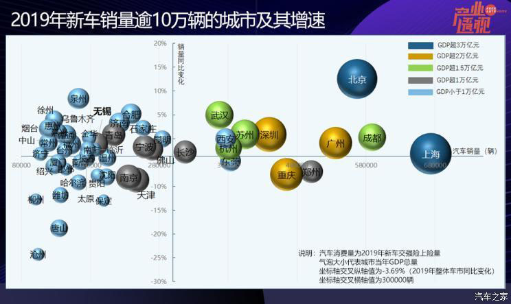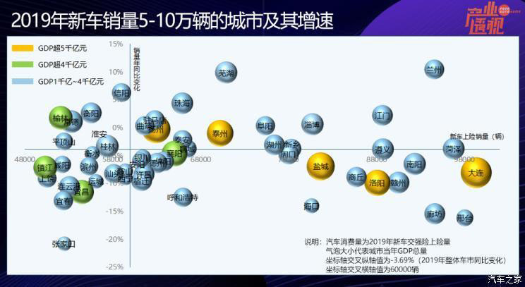 進(jìn)一步放寬視野,去年銷量超過20萬輛的城市有24個(gè),占當(dāng)年全國新車總銷量的40%; 年銷量10萬輛以上的城市有53個(gè),占同期全國的60%。這53個(gè)城市,就是國內(nèi)汽車消費(fèi)的“中堅(jiān)力量”,也是各大品牌的兵家必爭之地,那么這些城市未來的增長空間在哪里?從下圖可見,整體而言,GDP規(guī)模較小的城市,新車銷量也較低,甚至銷量增速也受其影響。