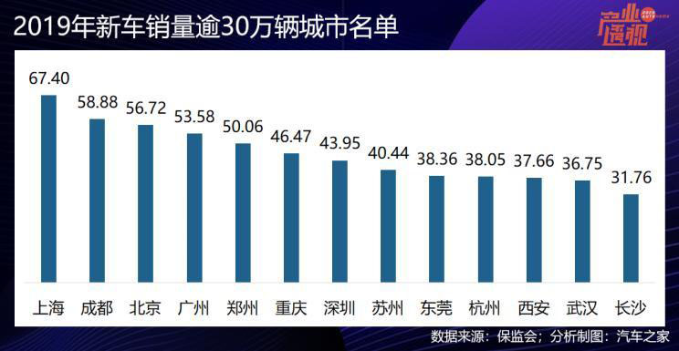 以2019年交強(qiáng)險(xiǎn)上險(xiǎn)數(shù)據(jù)看,國內(nèi)城市汽車新車年消費(fèi)量超過30萬輛的城市有13個(gè),這13個(gè)城市的汽車消費(fèi)600萬輛,占全國的27.7%。這里面除東莞和西安外,其他11個(gè)城市的GDP全部到達(dá)萬億級水平,上海和北京都超過了3萬億元,上海GDP最高(38155.32億元),新車銷量也最高(67.4萬輛),也是唯一一個(gè)新車銷量過60萬輛的城市。