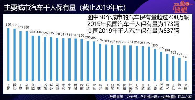 論及千人保有量(汽車保有量/常住人口),這30個(gè)汽車大城中最高的是蘇州,達(dá)到390輛,東莞與之接近,這兩個(gè)地方都是民營經(jīng)濟(jì)較為發(fā)達(dá)的地區(qū)。上海和和重慶2019年的千人保有量不到全國平均水平,北京則高達(dá)到276輛。我國國情不同,不能簡單對標(biāo)美國等地的千人保有水平,這30個(gè)城市中的大多數(shù)已經(jīng)“苦擁堵久矣”,在基礎(chǔ)設(shè)施和交通治理水平得到根本改善之前,汽車的消費(fèi)恐怕會以結(jié)構(gòu)性替代為主、新增為輔。