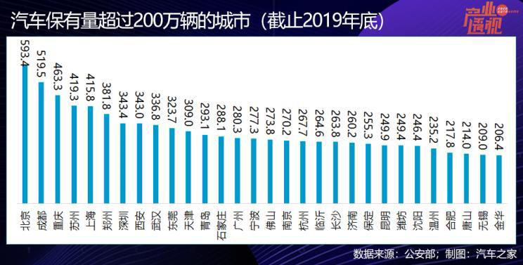2019年,我國有66個(gè)城市的汽車保有量超過了百萬輛,30個(gè)城市超過200萬輛。其中,北京、成都、重慶、蘇州、上海、鄭州、深圳、西安、武漢、東莞、天津這11個(gè)城市的汽車保有量超過了300萬輛,北京以593.4萬輛列全國第一,成都也超過500萬輛緊隨其后。