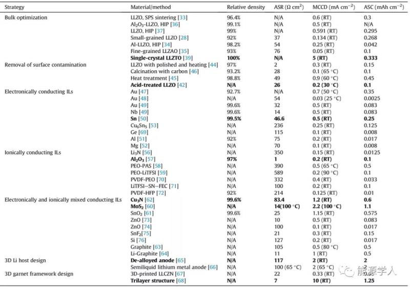 表1:近幾年報道的改善界面問題的數(shù)據(jù)匯總。主要包括電解質(zhì)片或中間層的制備方法、LLZO的致密度、面電阻(ASR)、文獻中報道的最大的電流密度(MCCD包含電池的臨界電流密度)以及面容量(ASC)等信息。