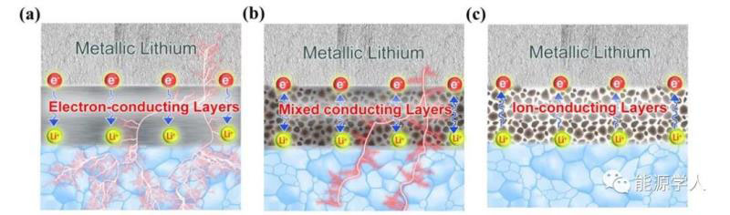 圖4:(a)電子導電中間層,(b)混合導電中間層,(c)離子導電中間層的鋰聚集與生長情況。