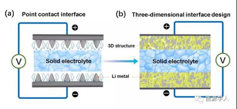 c-LLZO電解質(zhì)通常被加工成平的圓片狀,以此構成的對稱電池的表觀面積等于電解質(zhì)和鋰金屬之間的二維接觸面積,如圖3(a)所示,這時表觀電流密度與實際的面電流密度一致。當面電流密度超過一定值時,電解質(zhì)就會被鋰生長貫穿。如果是具有三維結構的界面,如圖4(b)所示,表觀面積要遠小于電解質(zhì)和鋰金屬之間的實際接觸面積。這樣施加同樣的電流,對稱電池可表現(xiàn)出更大的臨界電流密度,即表觀臨界最大電流密度增加,但單位面積的臨界電流密度保持是保持不變的。因此,這種方法是提高了陶瓷片電解質(zhì)的臨界電流而不是臨界電流密度。