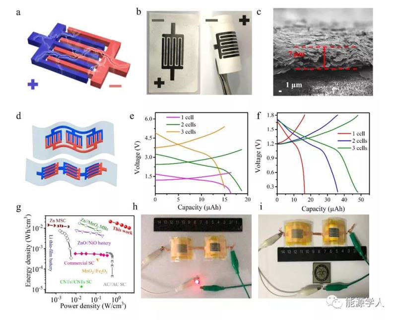 圖5. (a)平面交叉指鋅離子電池的示意圖和(b)其光學(xué)照片;(c)正極電極的橫截面SEM圖;(d)串并聯(lián)示意圖;(e)串聯(lián)和(f)并聯(lián)充放電曲線;(g)Ragone圖;(h-i) 平面交叉指鋅離子電池在彎曲狀態(tài)下點(diǎn)亮一個(gè)LED(h)和“DICP”標(biāo)志(i)的光學(xué)照片。