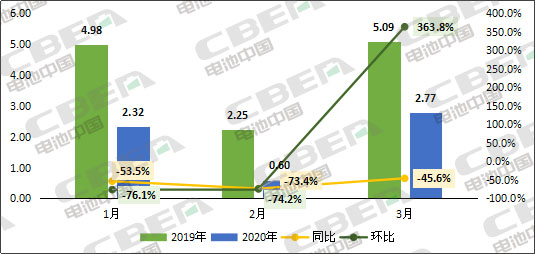 動力電池應(yīng)用分會研究部統(tǒng)計的整車合格證數(shù)據(jù)顯示,2020年一季度國內(nèi)新能源汽車產(chǎn)量達(dá)11.23萬輛,同比下降57.2%;搭載的動力電池裝機(jī)量約5.68GWh,同比下降53.8%。其中,3月份新能源汽車產(chǎn)量5.18萬輛,同比下降51.8%,環(huán)比增長335.0%;搭載的動力電池裝機(jī)量約2.77GWh,同比下降45.6%,環(huán)比增長363.8%。