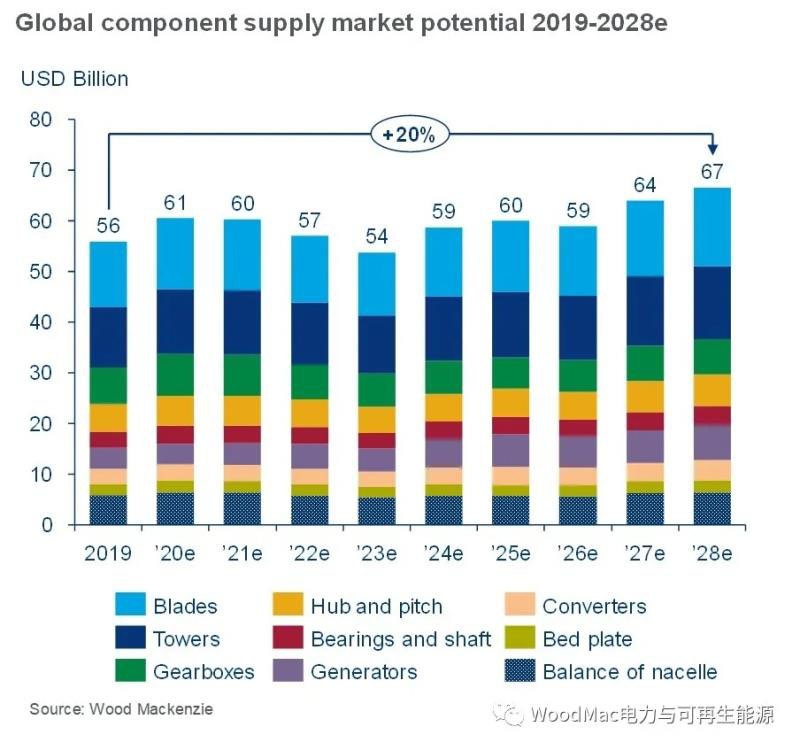 據(jù)伍德麥肯茲最新研究報告《2020年全球風(fēng)機(jī)供應(yīng)鏈?zhǔn)袌鲅芯俊?,預(yù)計2020年至2028年期間,全球風(fēng)機(jī)供應(yīng)鏈潛在市場價值將達(dá)到6千億美元,較2019年預(yù)測數(shù)據(jù)上調(diào)8%。
