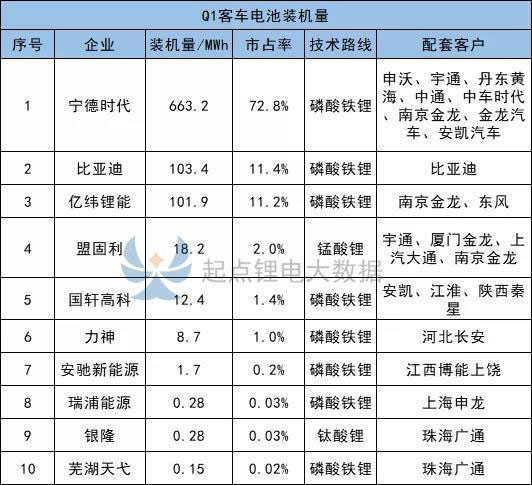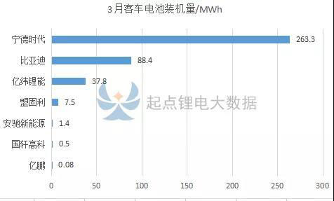 3月客車配套電池企業(yè)共有7家,分別是寧德時代、比亞迪、億緯鋰能、盟固利、安馳新能源、國軒高科和億鵬,其中僅寧德時代一家占比66%。