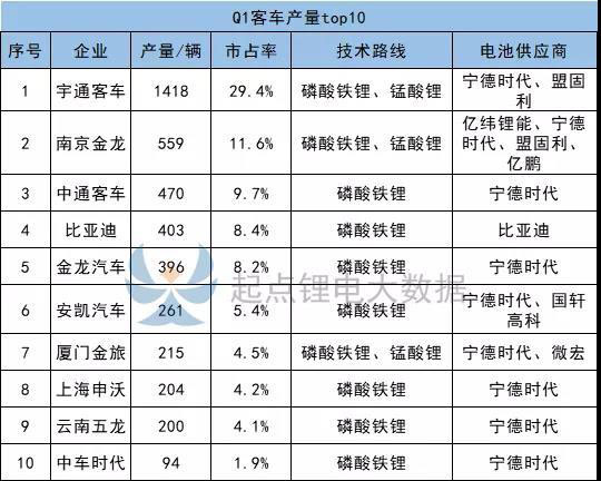 起點(diǎn)研究院(SPIR)數(shù)據(jù)顯示,今年3月新能源汽車產(chǎn)量為5.18萬輛,其中客車產(chǎn)量為1774輛,產(chǎn)量排名前十的企業(yè)分別是宇通客車、比亞迪、上海申沃、南京金龍、金龍汽車、中車時代、安凱汽車、廈門金旅、中通和揚(yáng)州亞星,如下圖所示: