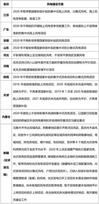 近日,江蘇、廣東、山東等10個(gè)省(自治區(qū)、直轄市)就國(guó)家能源局《關(guān)于做好2020年風(fēng)電和光伏發(fā)電項(xiàng)目建設(shè)工作的通知》做出了進(jìn)一步的安排。其中江蘇、廣東、安徽、山東、陜西、內(nèi)蒙古和新疆均明確不再安排需要國(guó)家補(bǔ)貼的新增陸上風(fēng)電項(xiàng)目。