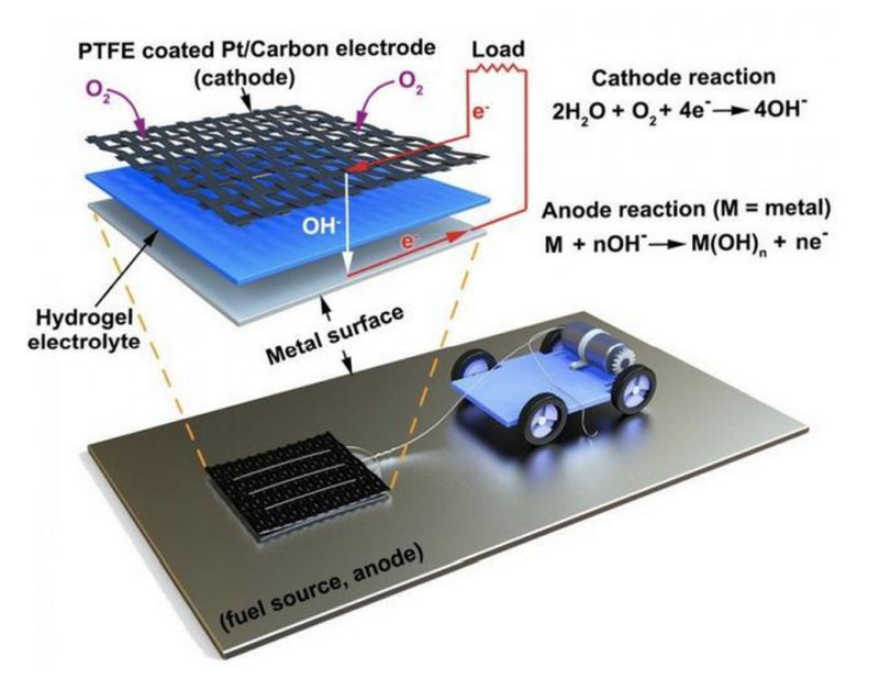該陰極則由碳組成并伴有聚四氟乙烯(PTFE)涂層及納米級鉑嵌入其中。電解質(zhì)是一種含有鹽水的水凝膠。當這種膠狀的物質(zhì)被拖到金屬表面時其就會氧化金屬表面以下的部分、分解化學鍵為其自身提供能量。與此同時,陰極材料正在減少其上方空氣中的氧氣。