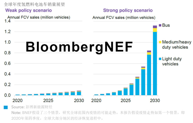 展望:為預估2030年的氫燃料電池車部署情況,BNEF分別在兩個情景中對其經濟性作出分析:一個政策扶持力度較弱的場景(假設現有政策不變)和一個政策扶持力度較強的場景(將當今最佳政策措施大范圍推廣)。雖然我們的經濟性分析表明,長途重型運輸是燃料電池車的最佳應用場景,但在兩種情景中,我們還是認為燃料電池輕型汽車在氫燃料電池車銷量中的占比最大。雖然結果看似很矛盾,但并非無跡可尋:現有政策和企業(yè)燃料電池車發(fā)展戰(zhàn)略重點是輕型汽車,以便實現燃料電池車的規(guī)?;圃臁?