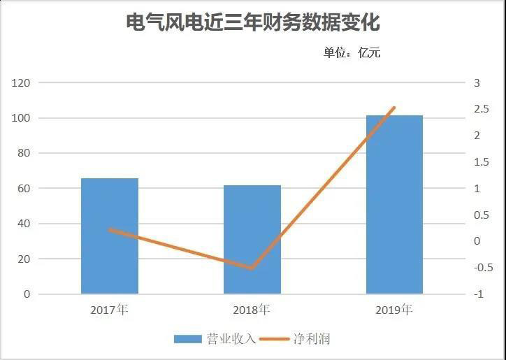 2017年、2018年和2019年,電氣風(fēng)電分別實(shí)現(xiàn)營(yíng)業(yè)收入65.57億元、61.71億元、101.35億元。