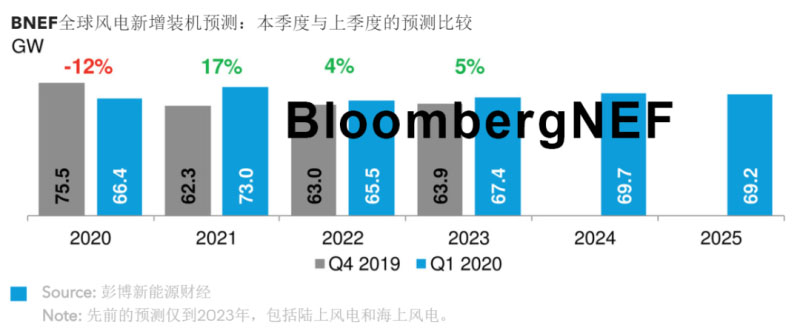疫情沖擊風(fēng)電行業(yè)后,BNEF風(fēng)電新增吊裝容量預(yù)測(cè)較上一季度的下調(diào)幅度