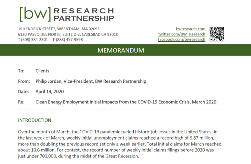 在清潔能源領(lǐng)域,由于居家禁足,節(jié)能工作人員不能進(jìn)入工作場(chǎng)地,太陽能、風(fēng)電、電動(dòng)車企業(yè)也在解雇工人,因?yàn)闊o法裝配機(jī)器和零件,并且資金鏈也已斷裂。根據(jù)美國BW Research公司的數(shù)據(jù)分析,僅在2020年3月,美國就有超過106,000名清潔能源從業(yè)人員(可再生能源,能源效率,清潔車輛和其他清潔能源)失去工作,這已經(jīng)抵消了2019年清潔能源領(lǐng)域的所有就業(yè)增長。BW Reearch公司預(yù)計(jì)在接下來的幾個(gè)月中,美國清潔能源領(lǐng)域?qū)?huì)有更多的裁員。