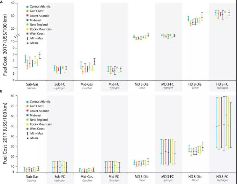 1)汽油車的燃料成本為每百公里5.0-8.6美元,而燃料電池汽車的氫氣成本在81種電費(fèi)下估計在每百公里4.9-6.3美元之間。在柴油應(yīng)用方面,與重型車輛相比,中型車輛的氫成本更有競爭力。中型車輛的氫氣成本估計在每百公里12.6-16.0美元之間,而相應(yīng)的柴油成本則為每百公里11.5-16.9美元。對于重型車輛,氫氣和柴油的成本分別為每百公里27.4-34.6美元和22.4-32.9美元。