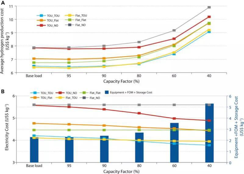 1)對于不對基本電費(fèi)或峰值電費(fèi)使用動態(tài)定價的模式,總氫生產(chǎn)成本(每種類別的電費(fèi)的平均成本)隨著產(chǎn)能因子的降低而單調(diào)增加。這是因為對于Flat_NO和Flat_Flat電費(fèi),電力成本是恒定的,而設(shè)備,固定操作和維護(hù)(FOM)和存儲成本隨產(chǎn)能因子的降低而按比例增加。