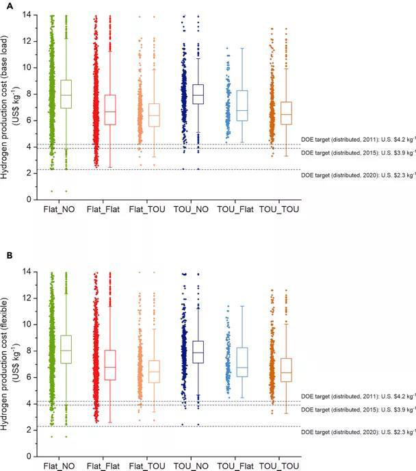 本研究中采用RODeO實(shí)驗程序結(jié)合要點(diǎn)1分析的電費(fèi)對電解槽的基本負(fù)荷和靈活運(yùn)行模式的制氫成本進(jìn)行估算。美國能源部(DOE)電解制氫的技術(shù)目標(biāo)分別是2011年,2015年和2020年分別為4.2千克/美元,3.9千克/美元和2.3千克/美元。成本估算發(fā)現(xiàn),F(xiàn)lat_Flat,F(xiàn)lat_NO,F(xiàn)lat_TOU和TOU_TOU四種類型的電價結(jié)構(gòu)下電解制氫成本已經(jīng)實(shí)現(xiàn)了美國能源部2011年的氫氣生產(chǎn)目標(biāo)。此外,全美81個商業(yè)和工業(yè)電費(fèi),可以使得電解制氫成本(包括存儲成本)控制在4千克/美元以內(nèi)。