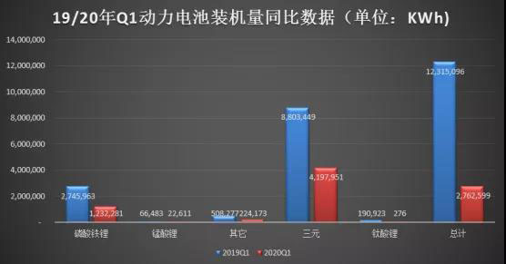 從不同電池類(lèi)型來(lái)看,2020年Q1磷酸鐵鋰電池裝機(jī)電量約1.23 GWh ,同比下滑55%,去年同期裝機(jī)電量約2.75GWh,同比增長(zhǎng)89%。