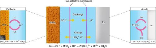 新型水系鋅-錳電池的結(jié)構(gòu)以及工作機(jī)制示意圖