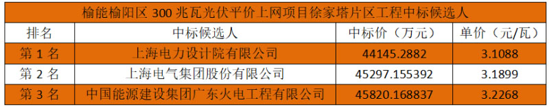 4月17日,陜西榆能榆陽(yáng)區(qū)300兆瓦光伏平價(jià)上網(wǎng)項(xiàng)目徐家塔片區(qū)工程中標(biāo)候選人公示。上海電力設(shè)計(jì)院有限公司(以下簡(jiǎn)稱(chēng)“上海院”)以44145.2882萬(wàn)元的總報(bào)價(jià)位列第一中標(biāo)候選人。