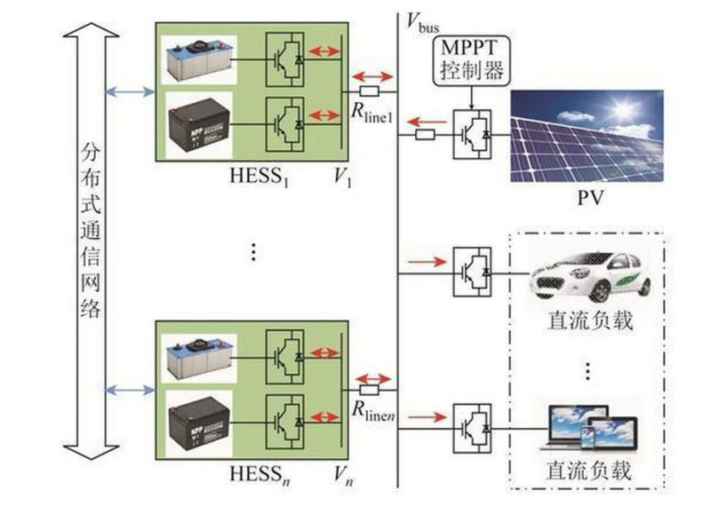 有學(xué)者則提出了一種分散式的HESS控制方法,蓄電池和超級(jí)電容分別采用虛擬電阻和虛擬電容下垂控制,根據(jù)不同的虛擬參數(shù)實(shí)現(xiàn)不同和相同儲(chǔ)能介質(zhì)間的功率分配。有學(xué)者同樣采用分散式控制結(jié)構(gòu),超級(jí)電容采用的是積分下垂控制,其本質(zhì)上與虛擬電容下垂控制相同,但同樣未考慮線路電阻的影響。不同于集中式控制,分布式控制不存在單點(diǎn)失效的風(fēng)險(xiǎn),具有較高的可靠性。而相比于分散式控制,由于存在通信網(wǎng)絡(luò),可以實(shí)現(xiàn)協(xié)調(diào)配合,因此又具有較高的經(jīng)濟(jì)性。