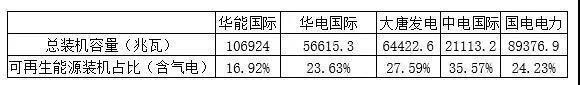 在可再生能源裝機(jī)比例(含氣電)方面,中電國(guó)際比例最大,為35.57%。大唐發(fā)電、國(guó)電電力、華電國(guó)際、華能國(guó)際依次為27.59%、24.23%、23.63%和16.92%。