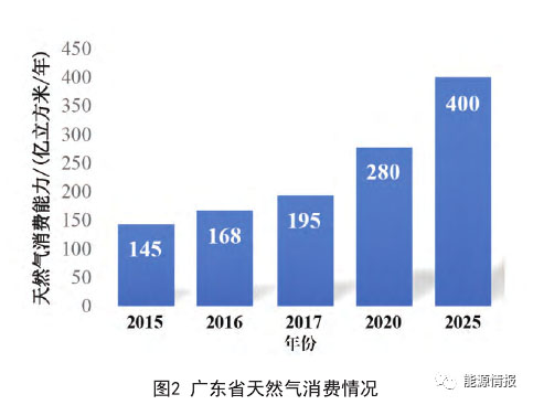 (2)分布式能源和6F 燃機將是廣東省新增氣電主體。當前廣東省各地市擬規(guī)劃新增的天然氣發(fā)電項目主要是分布式能源項目和6F 機組,未來這將是廣東省電力行業(yè)新增天然氣需求的重要載體。廣東省天然氣消費情況如圖2所示,到2020年,天然氣消費量比2015年翻一番,比重達到一次能源的11%,到2025年將預計達到15%。