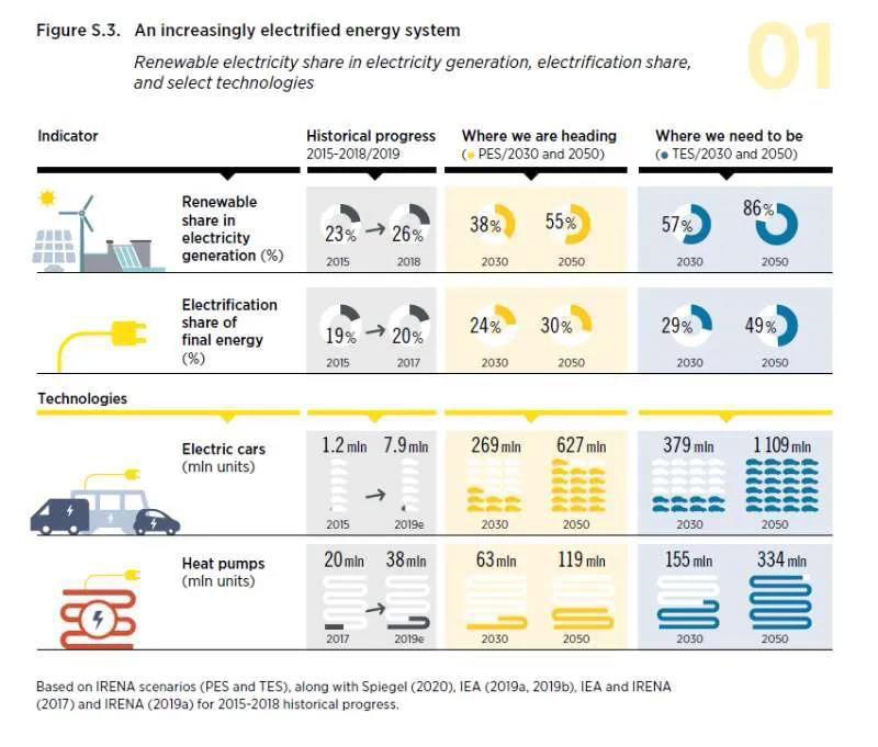 2018年可再生能源發(fā)電占全球發(fā)電量的26%,按照目前的規(guī)劃到2030年可達38%、2050年可達55%;但是按照巴黎氣候協(xié)定的要求2030年應達57%、2050年應達86%。