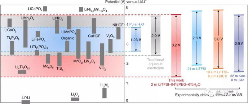 圖4. 各種水系電解質和電位電極材料的電化學窗口穩(wěn)定性的比較