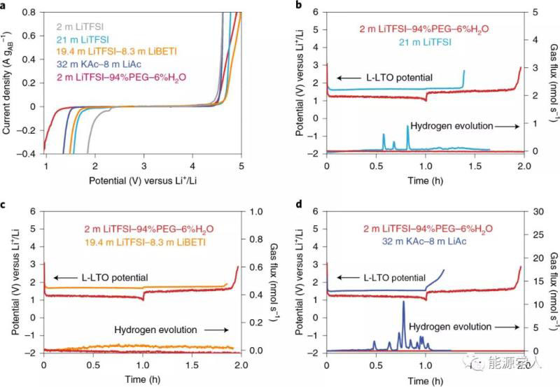 圖3. a)通過LSV確定的各種電解質的電化學穩(wěn)定性窗口;b-d)在21m LiTFSI(b)、水合熔體19.4m LiTFSI-8.3m LiBETI(c)和32m KAC-8m LiAc(d)電解質中進行的OEMS測試分別與2m LiTFSI-94%PEG-6%H2O的比較。