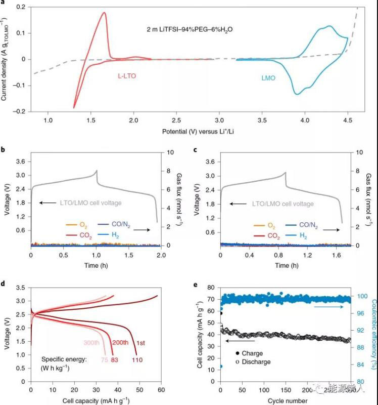 圖2. L-LTO/LMO全電池在2m LiTFSI-94%PEG-6%H2O電解質中的電化學行為和OEMS。a)在2m LiTFSI-94%PEG-6%H2O中LMO和LTO的CV曲線;b, c)L-LTO/LMO全電池在2m LiTFSI-94%PEG-6%H2O中,在第一(b)和第十(c)的OEMS結果;d)在1C倍率下,L-LTO/LMO全電池在2m LiTFSI-94%PEG-6%H2O中第1、200和300次循環(huán)的充放電曲線;e)相應的長循環(huán)性能。