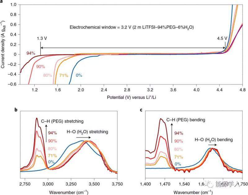 圖1. 分子擁擠型電解質的電化學穩(wěn)定窗口和FTIR光譜。a)LSV測試2m LiTFSI-xPEG-(1-x)H2O(x=0,71,80,90,94%)的電化學穩(wěn)定性窗口;b, c)一系列2m LiTFSI-xPEG-(1-x)H2O電解質的歸一化FTIR。