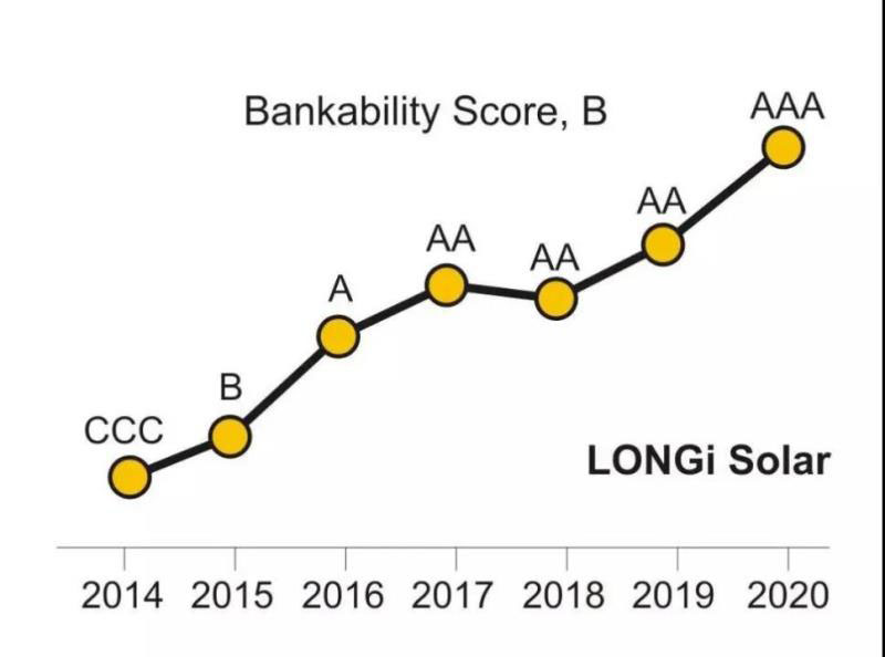 在最新發(fā)布2020年Q1 PV ModuleTech可融資性評級報告中,隆基成為首個也是唯一一個獲得AAA評級的組件供應企業(yè),創(chuàng)下目前該評級報告中所統(tǒng)計最高水平,也同時是全球光伏組件供應商可達到的最高級別。技術領先讓隆基股份獲得了高速的成長和發(fā)展,成長為了全球最大的單晶光伏產(chǎn)品制造商,在全球光伏產(chǎn)業(yè)中取得了領先地位。