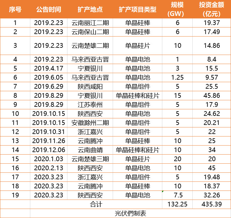 2020年3月23日隆基公告稱,擬投資70.11億元,建設嘉興年產(chǎn)5GW單晶組件項目、騰沖年產(chǎn)10GW單晶硅棒項目和西安航天基地一期年產(chǎn)7.5GW單晶電池項目,需要注意的是,這三個項目均在今年年內(nèi)開始投產(chǎn)。根據(jù)隆基財報,到2020年底,單晶硅片年產(chǎn)能達到75GW以上,單晶組件產(chǎn)能達到30GW以上。 光伏們將隆基2019年2月至今發(fā)布的擴產(chǎn)信息統(tǒng)計如下: