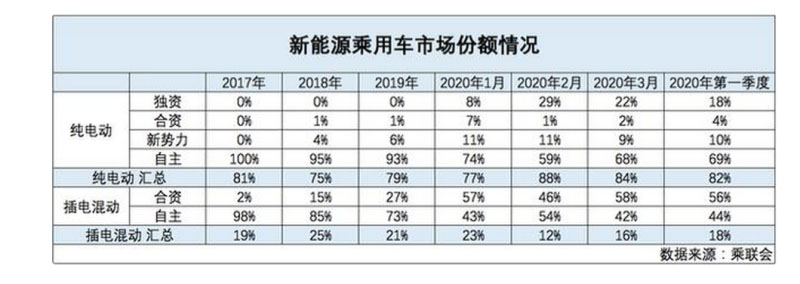 隨著特斯拉正式在國(guó)內(nèi)交付,新能源乘用車市場(chǎng)形成四大“派系”,分別是獨(dú)資車企、合資車企、造車新勢(shì)力和自主品牌傳統(tǒng)車企,在2020年之前自主品牌傳統(tǒng)車企向來(lái)是一家獨(dú)大,市占率達(dá)到90%以上,然而進(jìn)入2020年,自主品牌傳統(tǒng)車企的市場(chǎng)份額卻正在被大肆蠶食。