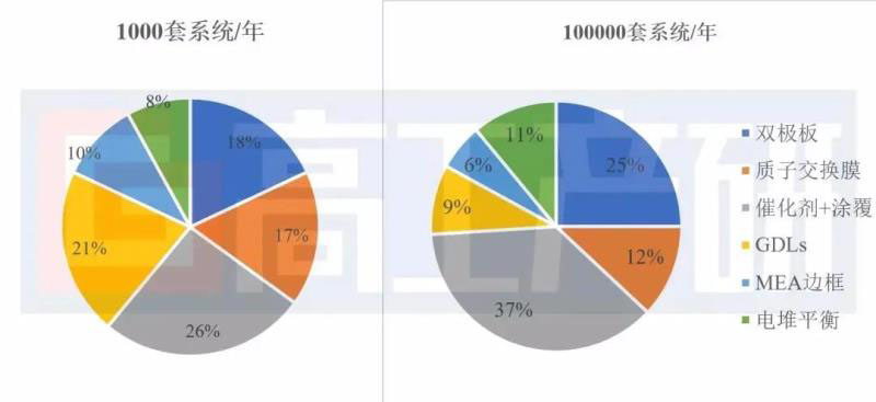 隨著國內燃料電池市場發(fā)展,國內催化劑需求量將會快速增長。美國能源部以80kW質子交換膜燃料電池電堆為例,按照2017年技術水平對不同規(guī)模的燃料電池電堆的成本組成進行分析。