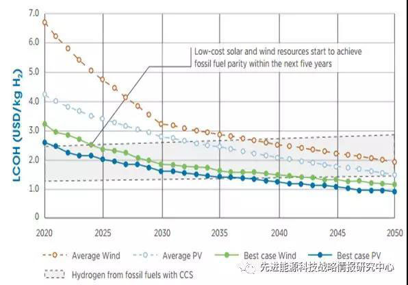 圖3 風電和光伏發(fā)電制氫成本發(fā)展趨勢(單位:美元/kg)