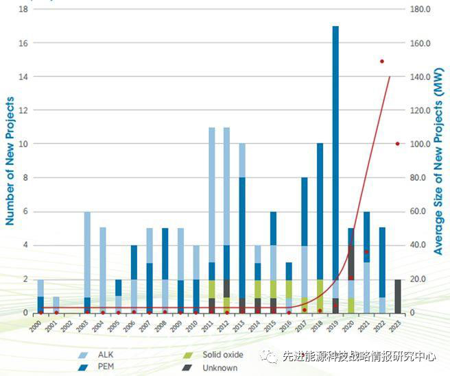 圖1 2000-2023年全球新增電解制氫項目變化態(tài)勢(左軸:項目數(shù)量;右軸:新項目平均規(guī)模<兆瓦>)